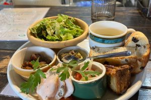 それ以外にもスープもついています。野菜を食べてから飲んだせいか、スープはとても薄い味。お肉は唐揚げなのですが、想定したよりも小さくて物足りない感じでした。