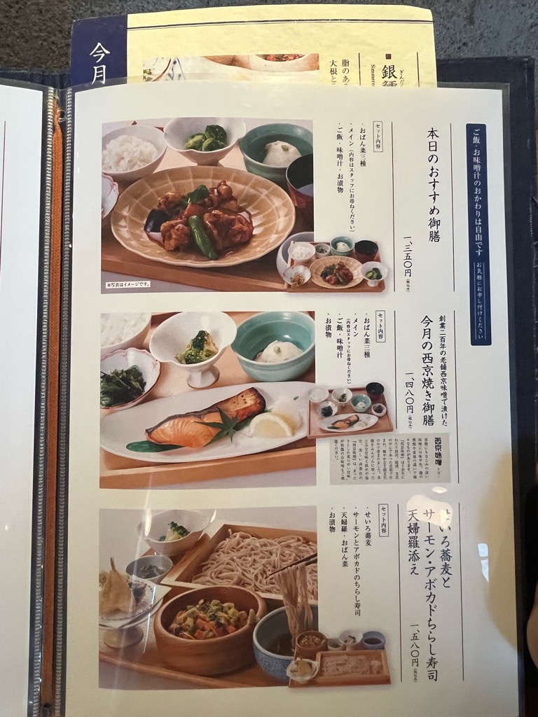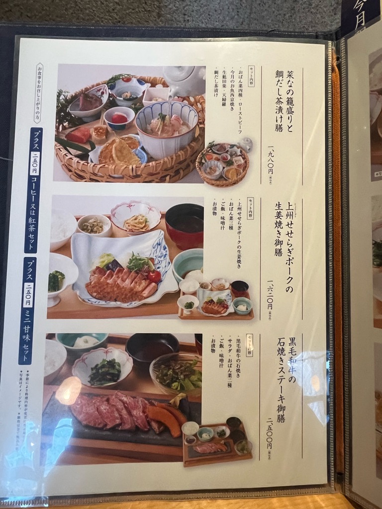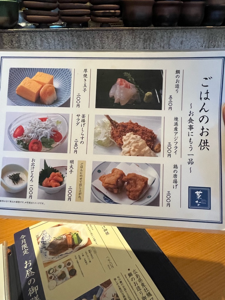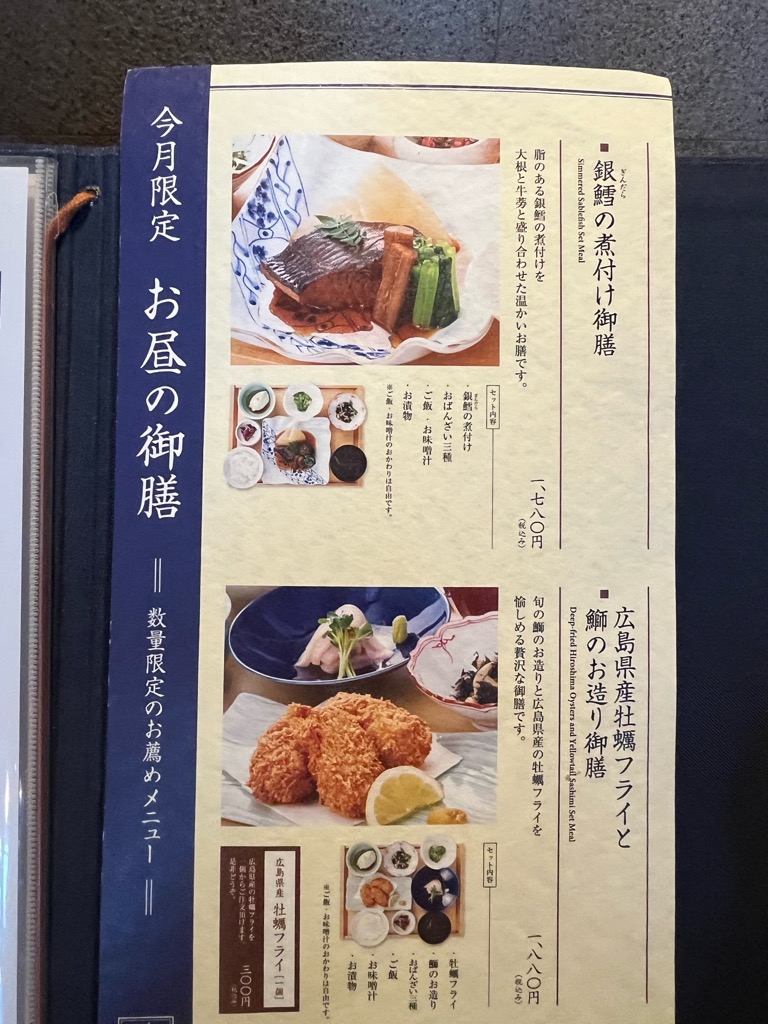 メニューがこちら。今回は「銀鱈の煮付け御膳(1780円)」と「アジフライ(300円)」を注文。