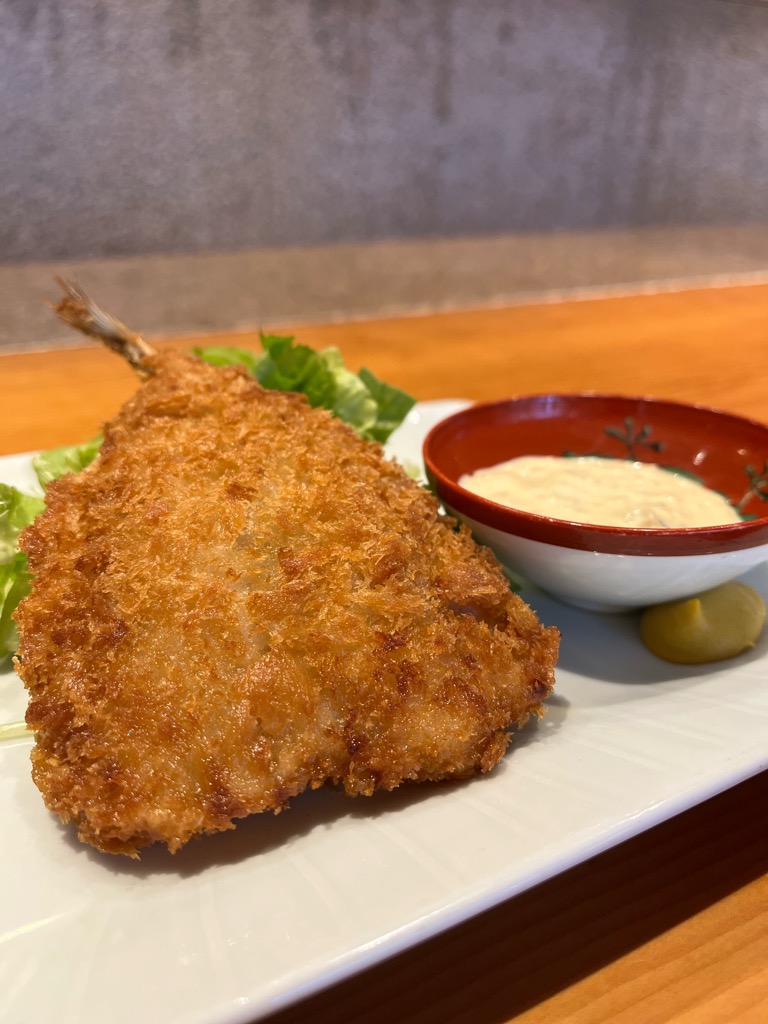 アジの身はふっくらと厚みがあり、噛みしめるごとに広がる海の香りと程よい塩味が、衣の香ばしさと見事に絡み合います。