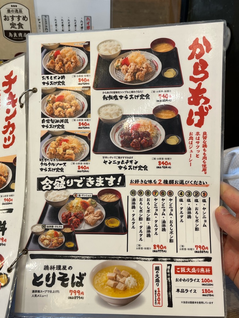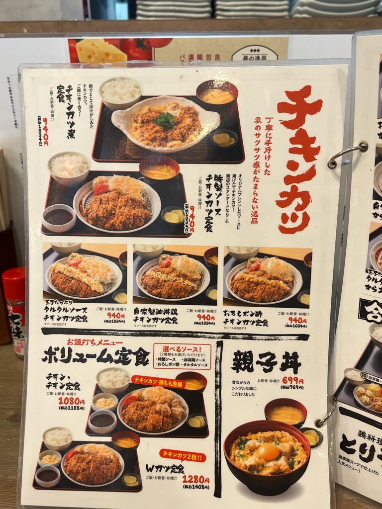 メニューがこちら。今回は「チキン・チキン定食(1080円)」を注文。