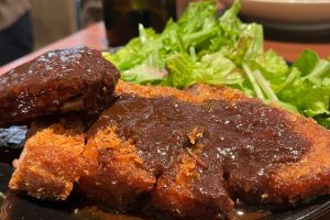 「ぶたやき」はまず目を引く焼き色。衣はなく、豚ロースそのものが黄金色にパチッと輝いています。
