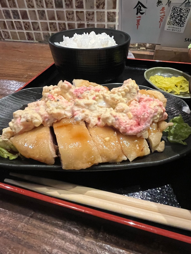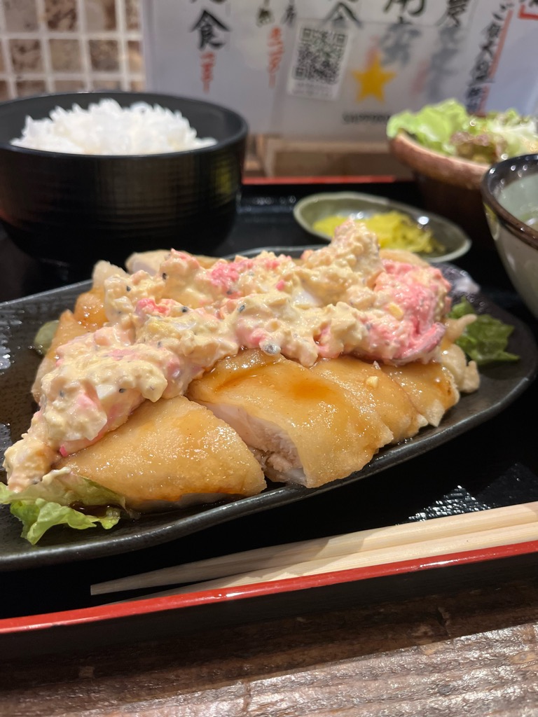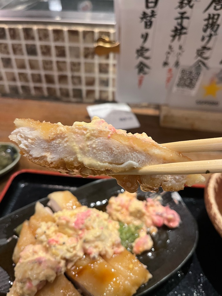 チキン南蛮は衣のサクッとした歯触りが舌を迎え、続いてじゅわっとした鶏胸肉のジューシーな旨みが広がります。