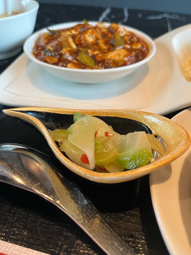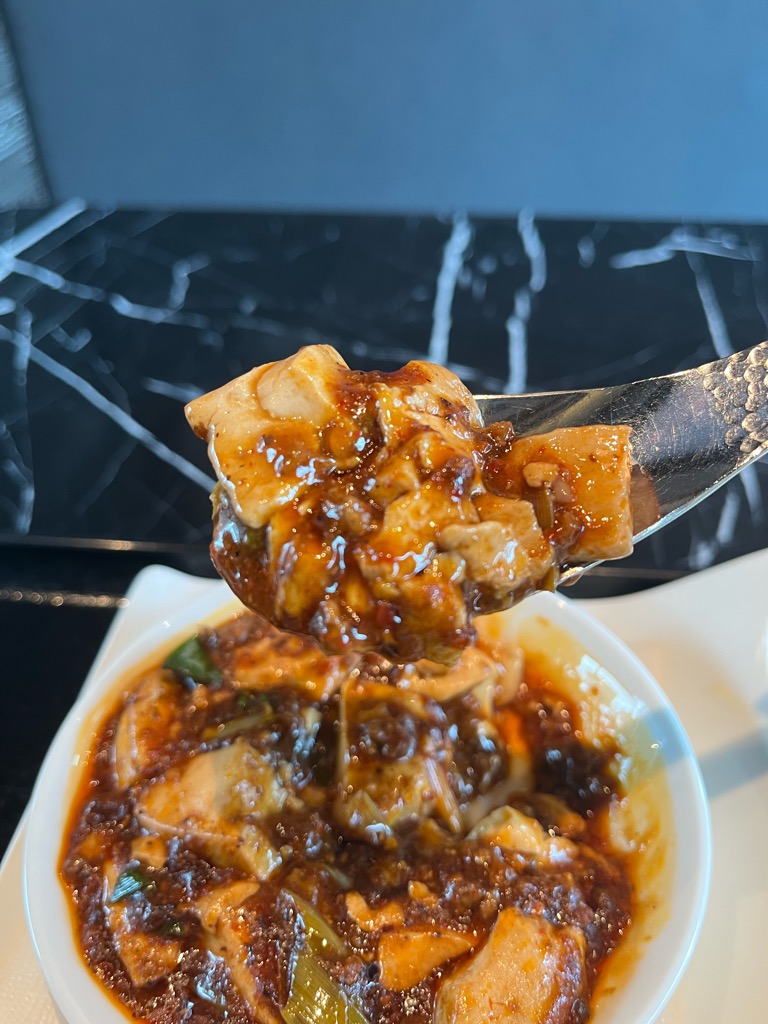 真っ赤に色づいた辣油と山椒の粒が豆腐を彩る鮮やかな皿。
