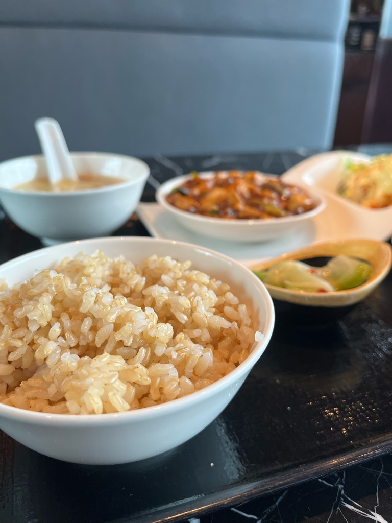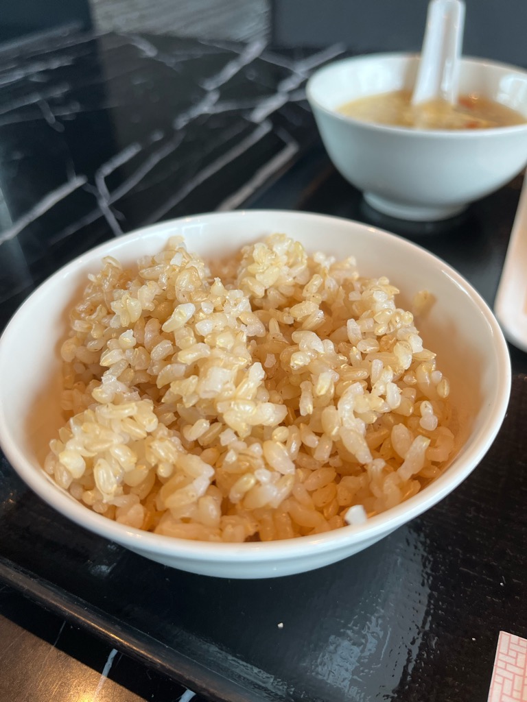 玄米は小ぶりの器にふっくらと盛られ、粒立ちの良さが視覚からも伝わります。香ばしい甘みと穀物の豊かな香りが、主菜とのバランスを予感させます。