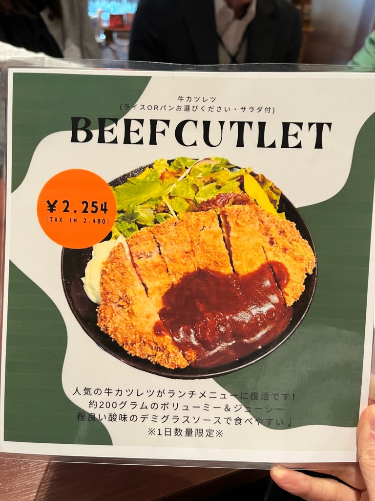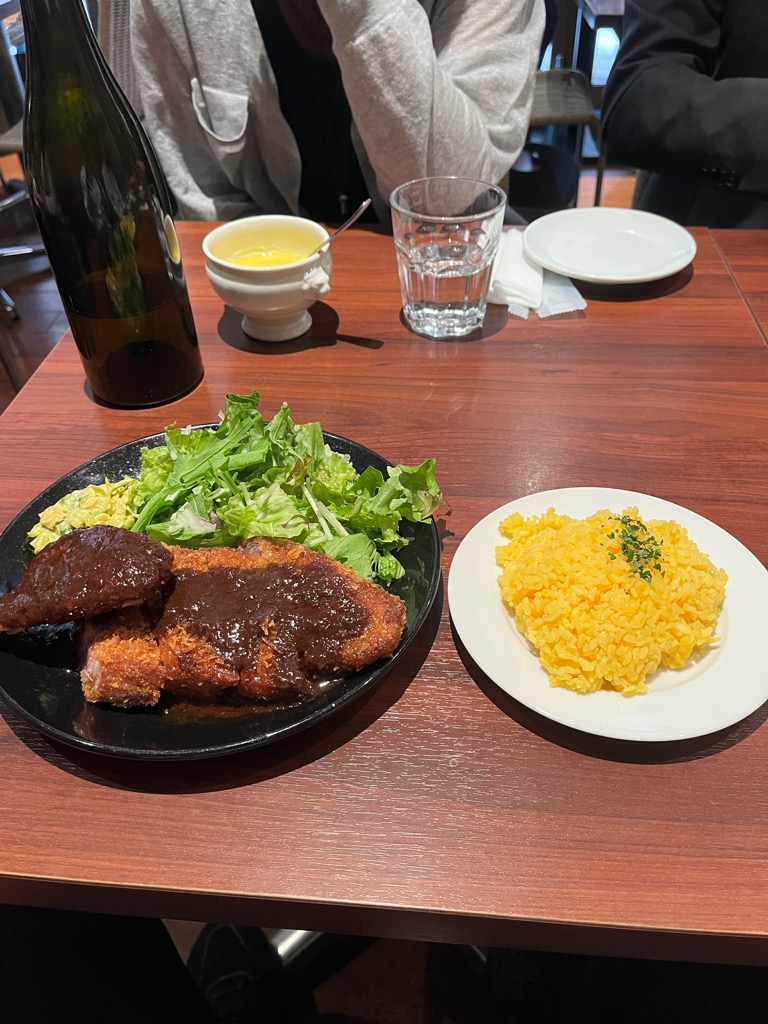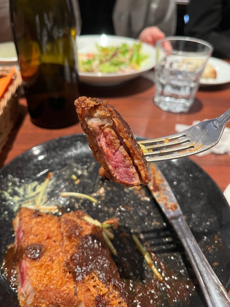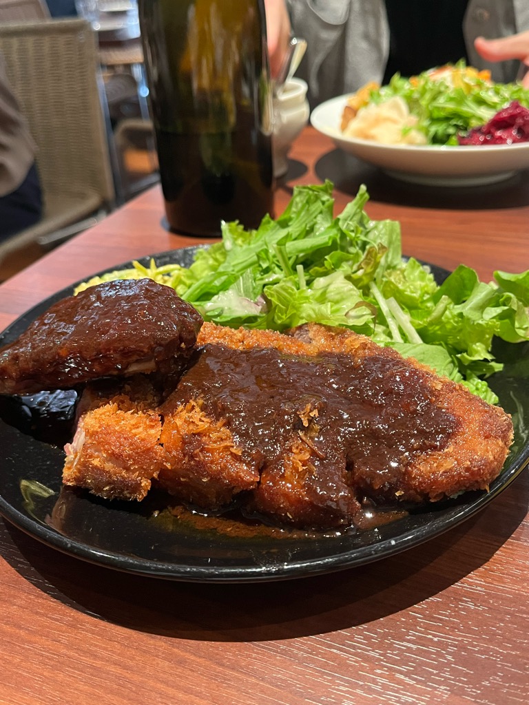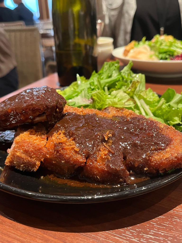 運ばれてきた瞬間に視界を捉えるのは、外はきめ細やかな黄金衣に包まれ、内側の赤身肉が程よく肉汁をたたえているカット面。
