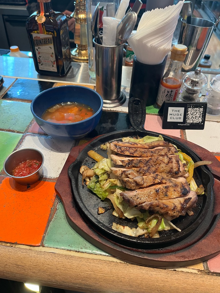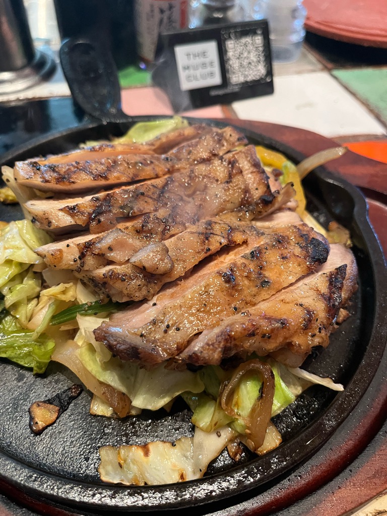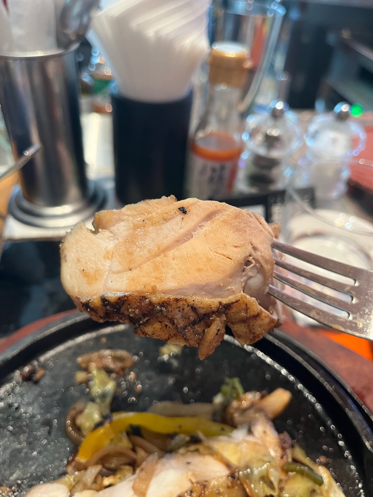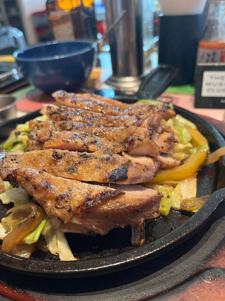 注文してから10分経過して料理が到着。運ばれてきた瞬間、鉄板の上でジュウジュウと音を立てる鶏肉と彩り豊かな野菜の饗宴は、視覚からすでに食欲を刺激します