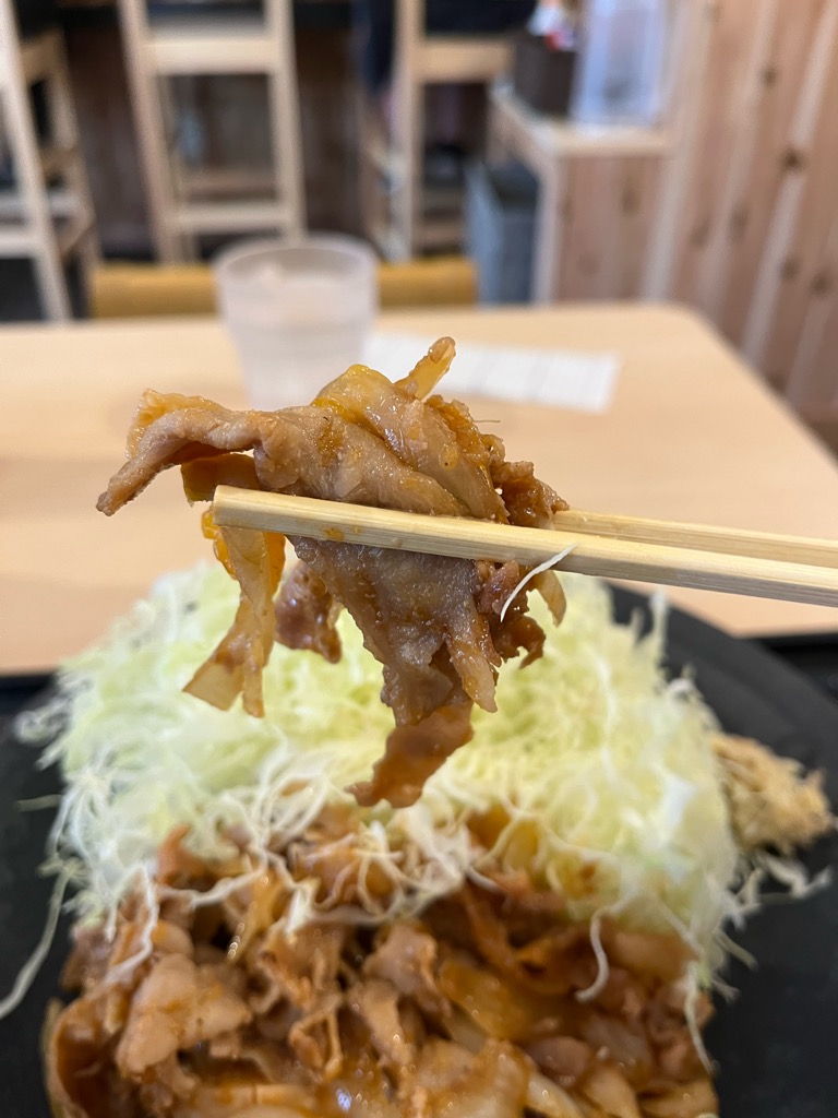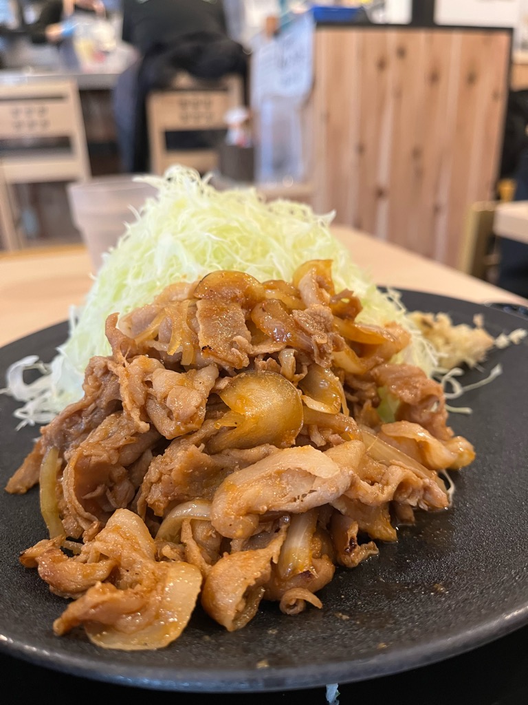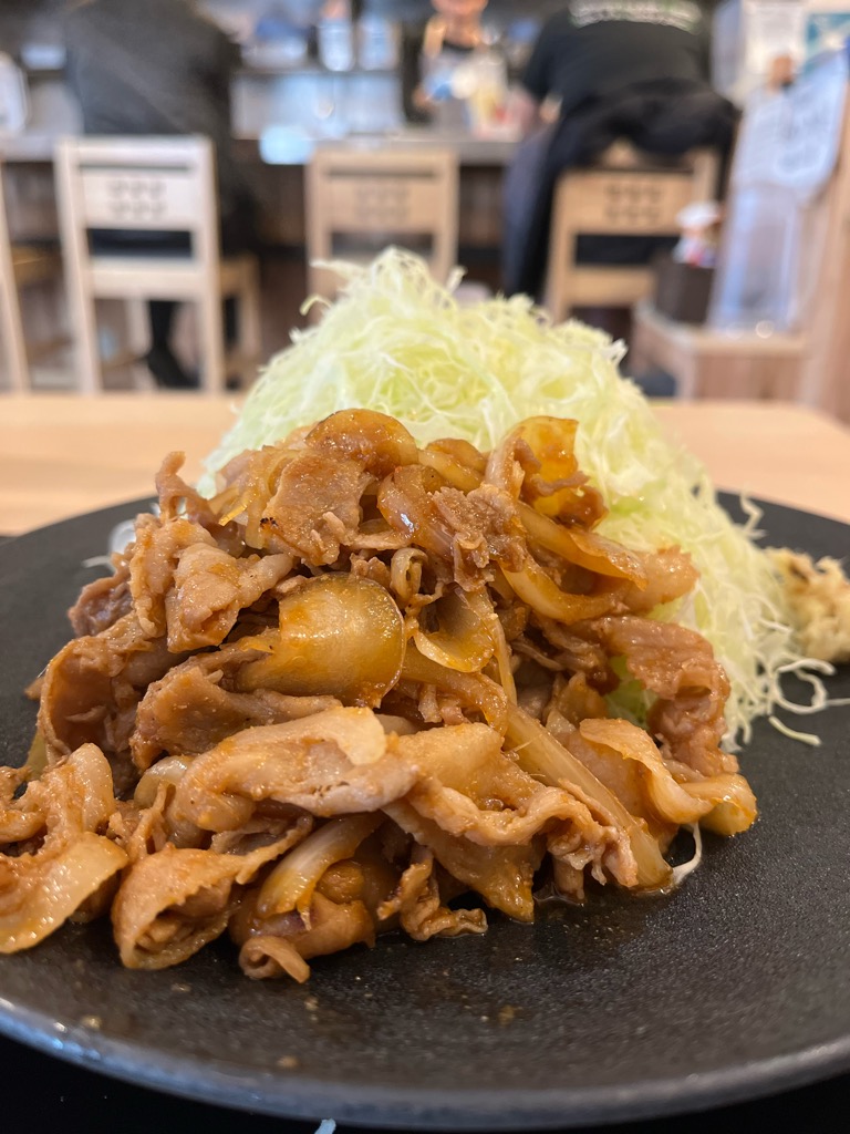 真っ白な陶皿に美しく盛り付けられた豚肉は、深みのあるタレに艶やかな照りをまとい、赤みと黄金色が織りなす色彩が食欲をかきたてます。キャベツは無料でお代わりできるのですが、てんこ盛りで不要でした。