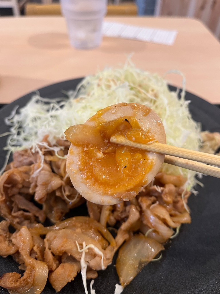 生姜焼きのなかには半熟卵が。