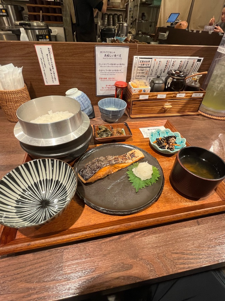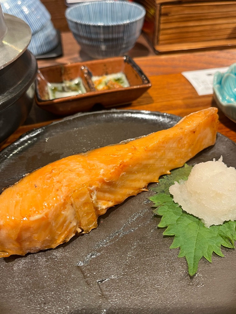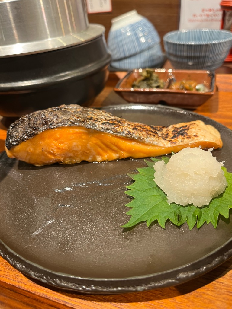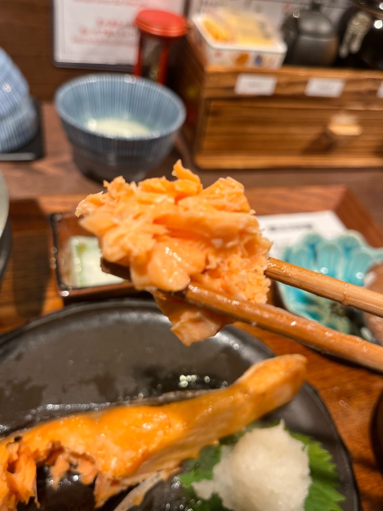 箸で触れると、皮目はパリッと、小骨を避けながら身をほぐすと、ほろりと繊維が裂ける。口に運ぶと、まず温かさが舌を包み、そのあとに塩がじんわりと染み出し、鮭特有の旨味と脂の甘さがじわりと広がる。