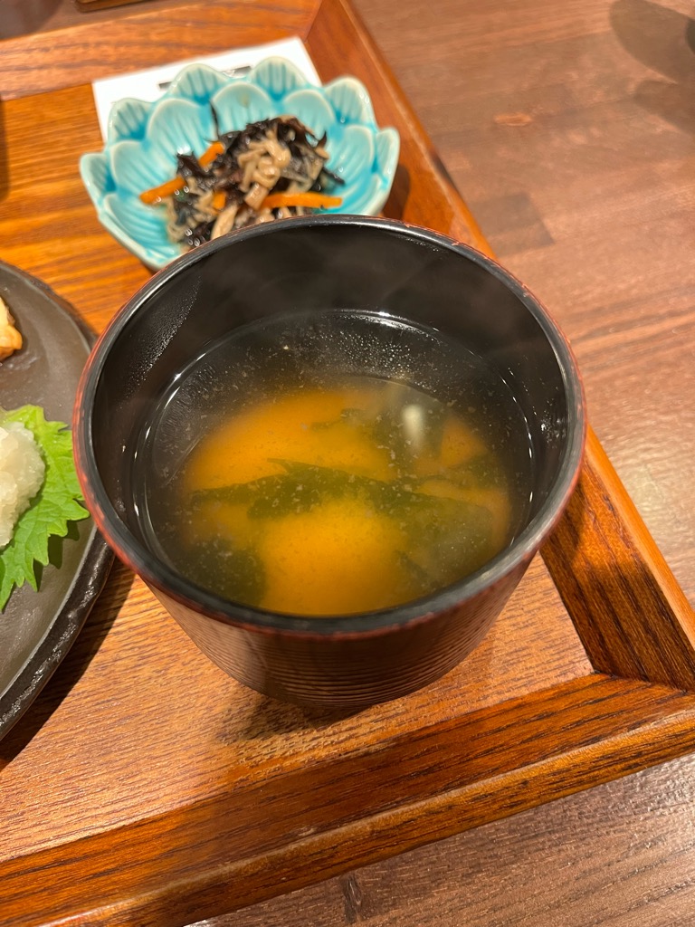 お味噌汁は、味噌のまろやかさとだしの深みが心地よく、少し冷めたご飯と合わせると、ほんのり心がほぐれるような安心感。