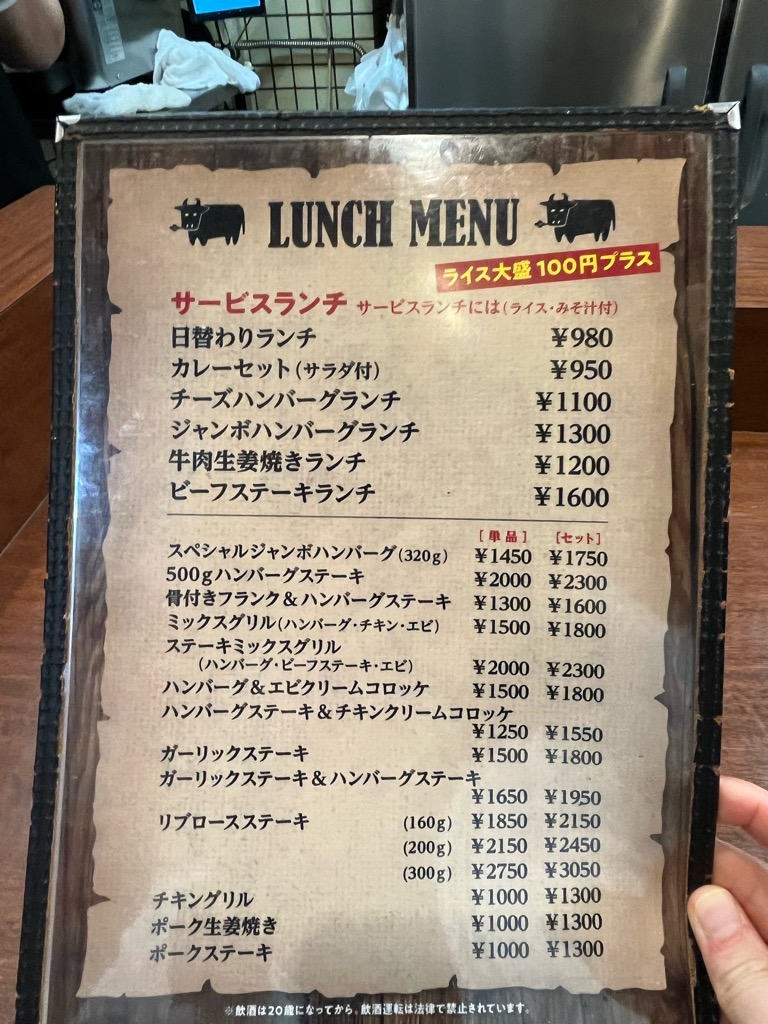 ランチメニューがこちら。今回は「スペシャルジャンボハンバーグ(320g)」を注文。