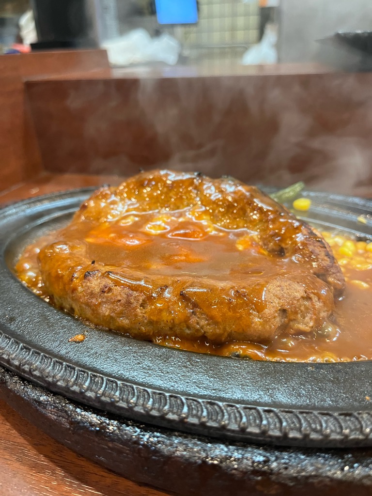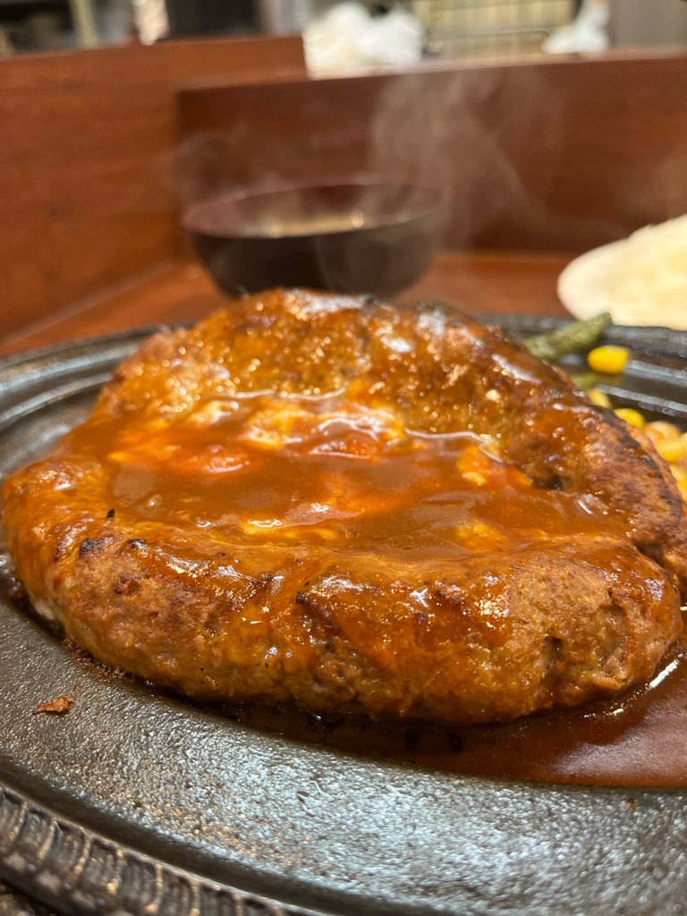 ソースは濃厚なデミグラス。ツヤととろみを湛えたそれが、ハンバーグの上からとろりと流れ落ち、ジュウジュウと音を立てています。