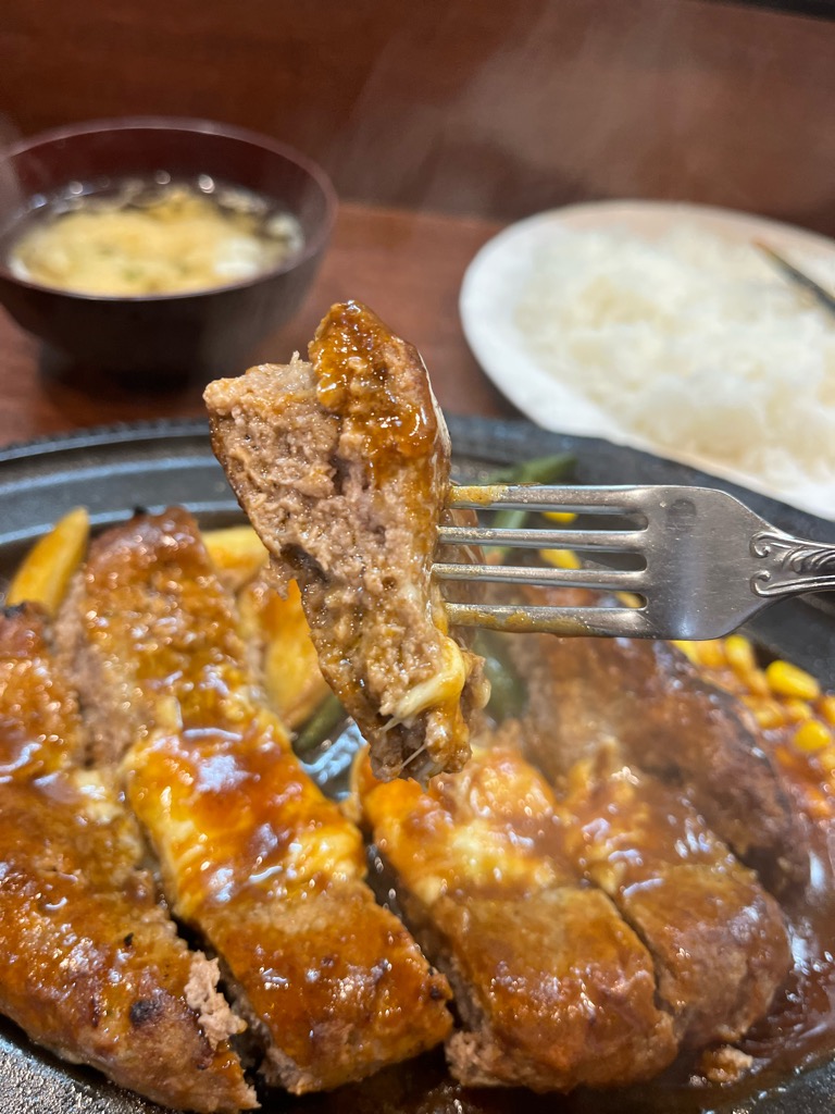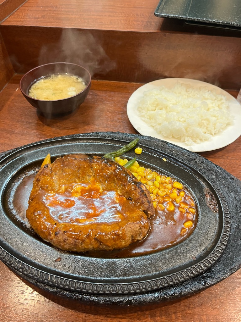 目の前に置かれた鉄皿の上、中央に鎮座するのは迫力のあるハンバーグ。表面にはしっかりと焼き目がつき、焦げの香ばしさが立ち昇ります。