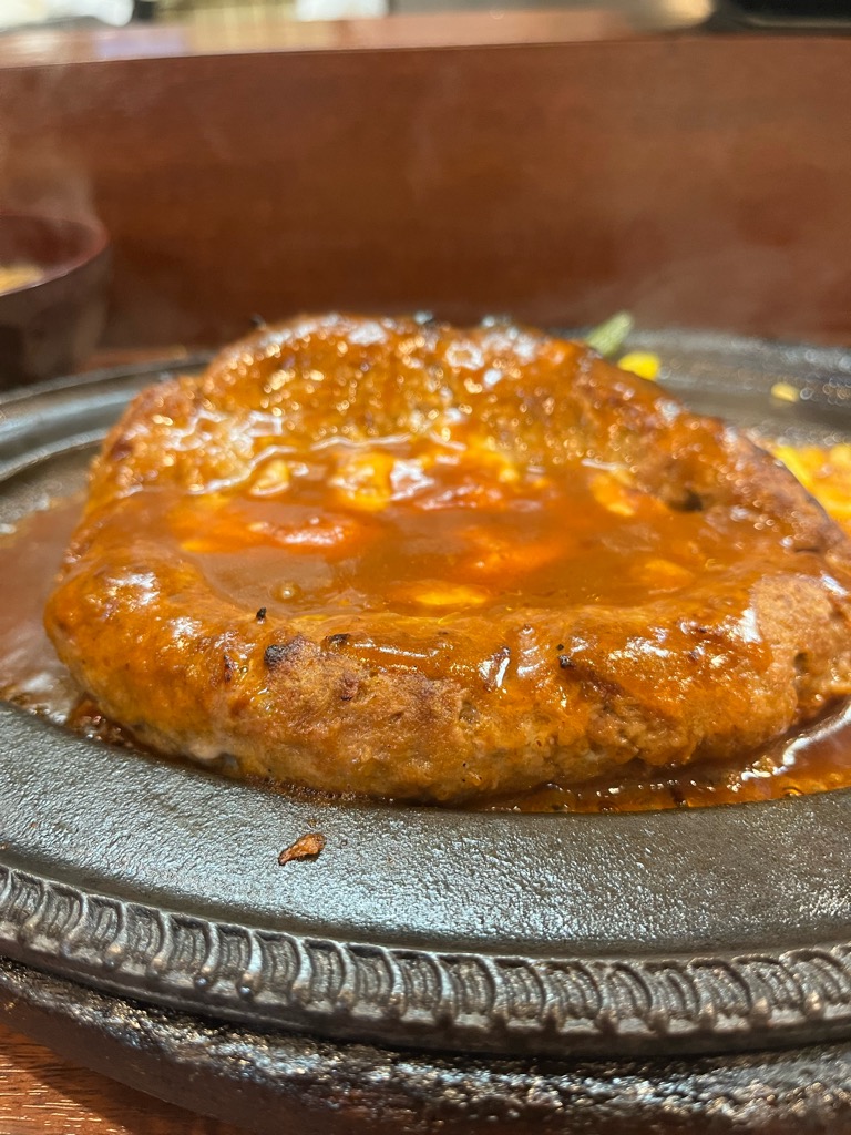 ソースは濃厚なデミグラス。ツヤととろみを湛えたそれが、ハンバーグの上からとろりと流れ落ち、ジュウジュウと音を立てています。