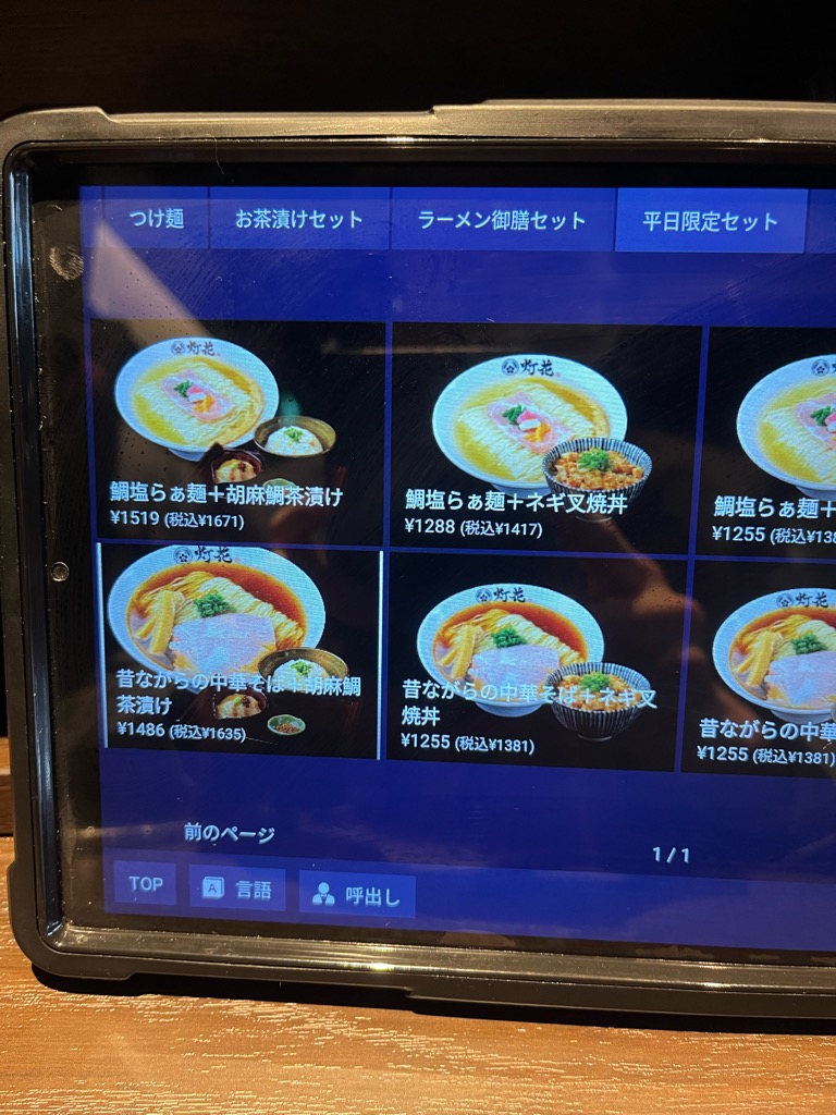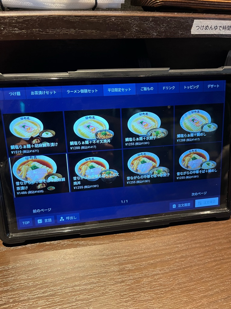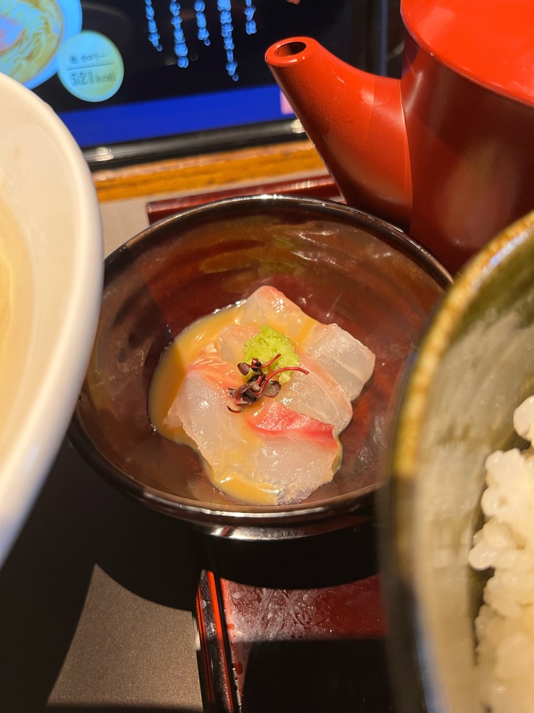 今回は「鯛塩らぁ麺+胡麻鯛茶漬け(1671円)」を注文。