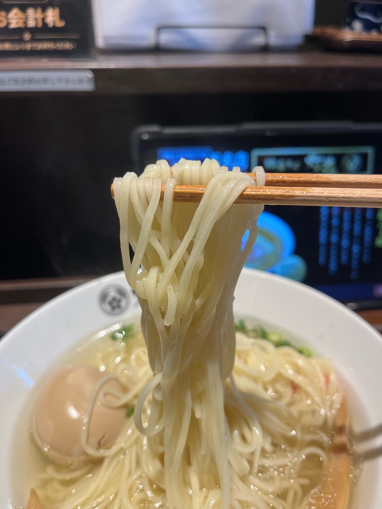 細めのストレート麺は、つるっとなめらかな口あたり。すすったときに、麺とスープがいっしょにふわっと広がります。ほどよいコシがあり、かむと小さく「ぷつっ」と心地よい食感。