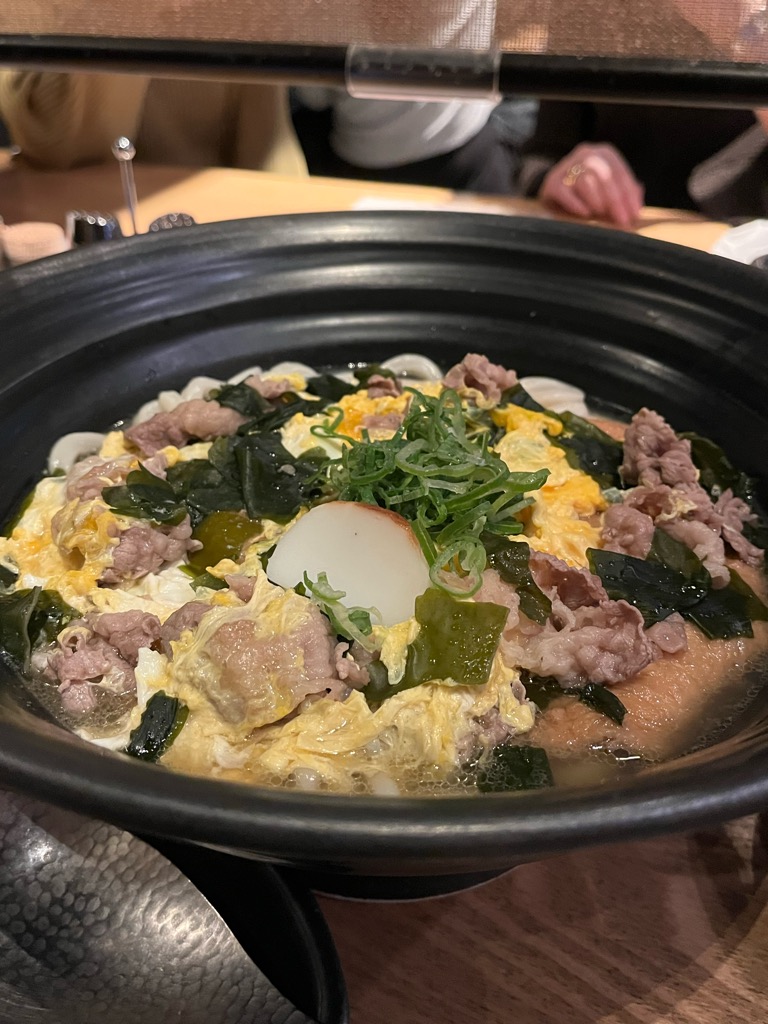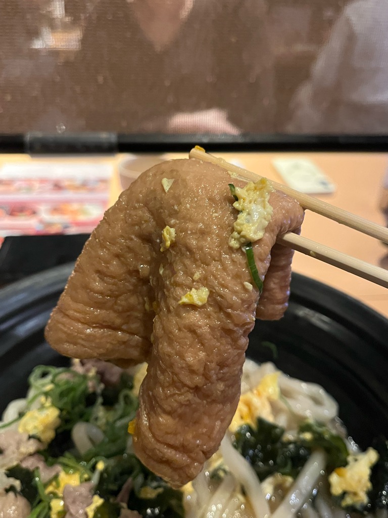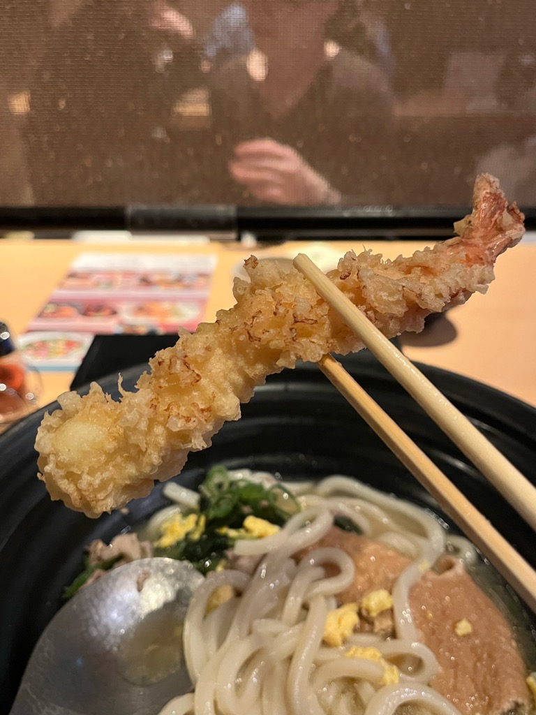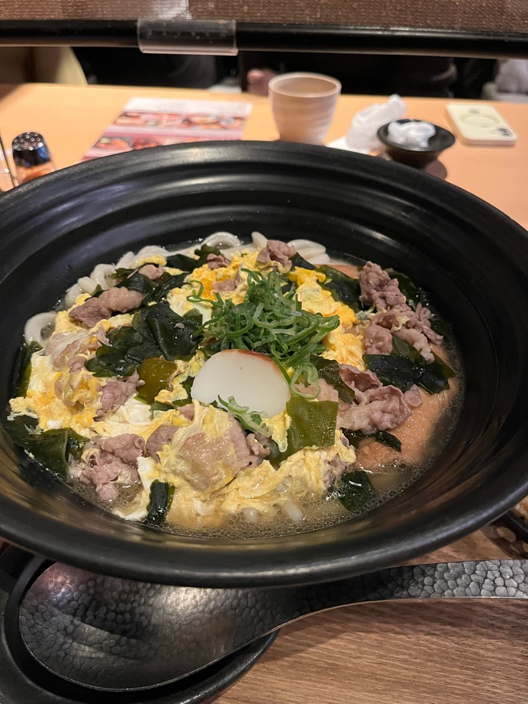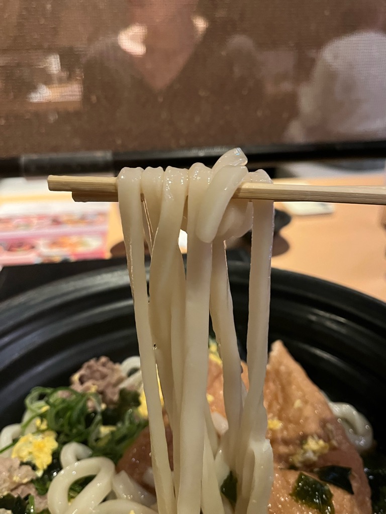 つるつるっとした太めのうどんは、熱々のおつゆにしっかり絡んで、噛むたびにもちっとした食感を楽しめます。